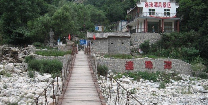连珠潭位于西安市长安县沣峪河上游的南石槽万华山景区,秦岭梁北侧,距西安市50公里,沟道幽静,森林茂密,山环水绕、秀丽异常。沟内峰峦层叠、山势峻峭,孤峰入云、岩石奇巧,瀑布潭间如飞龙串珠,无数奇崖怪石掩映在密林巨树,奇花异木之中;冰河翠之雄,龙潭子之奇,奇秀峰之险,芦花河之秀、秦岭梁之幽、连接飞瀑7个,如银河倒挂;绝壁栈道,小景连连,沿途花溪素练,玉挂珠帘,金蟾待樵,大圣拜佛,冰山遗迹巨石如海,高山草甸繁花点点,原始森林奇杉古松,景色雄奇,或在山谷寻幽静之处。或登上顶峰览众山小,群山叠嶂,苍翠无涯,雪色苍茫。瀑下皆有潭,飞瀑入潭,激起千层雾,形成万道虹,置身园中,如入仙境。连珠潭景区位于秦岭沣峪深处,距西安市区40多公里的喂子坪附近。整个景区位于一个深谷中,一条小溪一路伴着游人,景区内多潭,多瀑布,凉爽无比,林木茂密,游客晒不到太阳。景区里有一片林子,被很多藤蔓缠绕。在这里,胳膊粗的藤蔓和较细的藤蔓交错缠绕,有些搭缠在树上,有的则直接就拖在地上,整个林子充满原始色彩,让所有旅友称奇。有的藤蔓像秋千,一些孩子还坐在上面荡了起来。古树、藤蔓挡住了阳光,这里凉快,充满快乐!此处可以露营,也可以吃住客栈,是消夏避暑的绝佳去处。