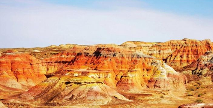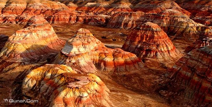 五彩城北距富蕴县城约280公里,海拔约650米。一般由倾角不大的侏罗纪地层构成,岩画凹凸相间。与乌尔禾魔鬼城的雅丹地貌相比更具有良好的视觉效果。另还有更加丰富的旅游活动内容,如采捡玛瑙石,观赏荒漠野生动物等,是观光旅游、猎奇、科学考察、科普教育、摄影等的理想场所。五彩城在地质历史上是个古湖盆,后经地壳上升,水冲风蚀,形成了现在的奇观。五彩湾是受风力和流水作用形成的侵蚀台地。分布面积5平方公里左右。五彩湾外观属丘陵地形。岩石色泽不一,有紫红、褐红、姜黄、土黄、灰 绿、灰黑、灰白相间,色彩和情调随太阳照射角度的变化而变化,酷似五彩古堡。是电影《卧虎藏龙》的外景地之一。