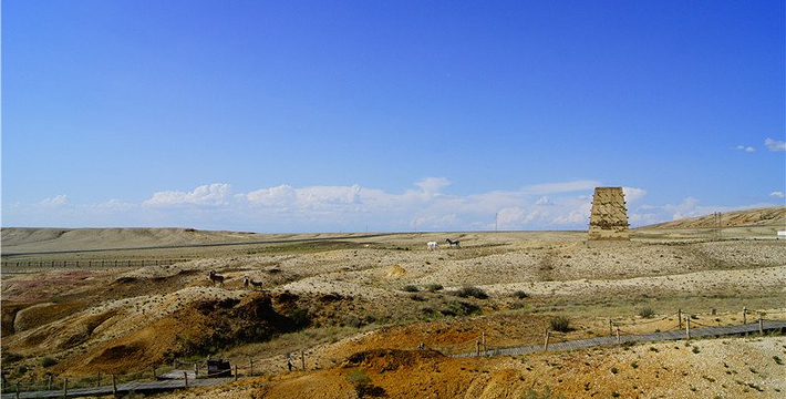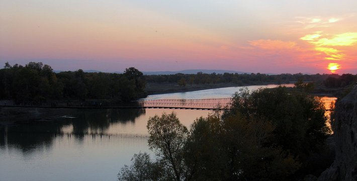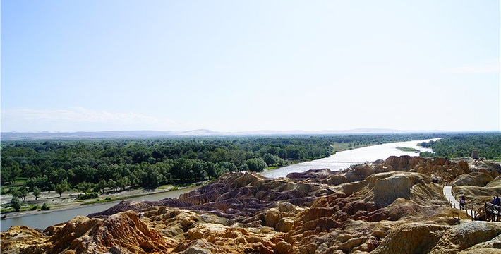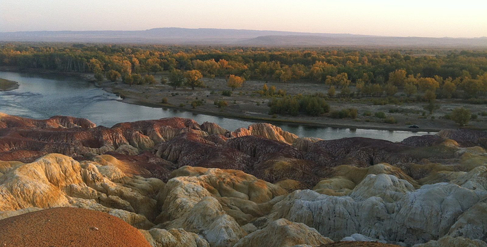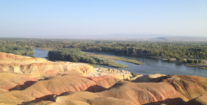 五彩滩位于布尔津县城以北约24公里处,是前往哈巴河县与喀纳斯的必经之路。它毗邻碧波荡漾的额尔齐斯河,与对岸葱郁青翠的河谷风光遥相辉映,可谓“一河隔两岸,自有两重天”。激猛的河流冲击以及狂风侵蚀,形成了北岸的悬崖式雅丹地貌,河岸岩层抗风化能力强弱不一,轮廓便会参差不齐,而岩石含有矿物质的不同,又幻化出种种异彩,因此得名“五彩滩”。而南岸却是绿树葳蕤,连绵成林,远处逶迤的山峦与戈壁风光尽收眼底。