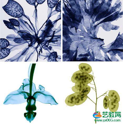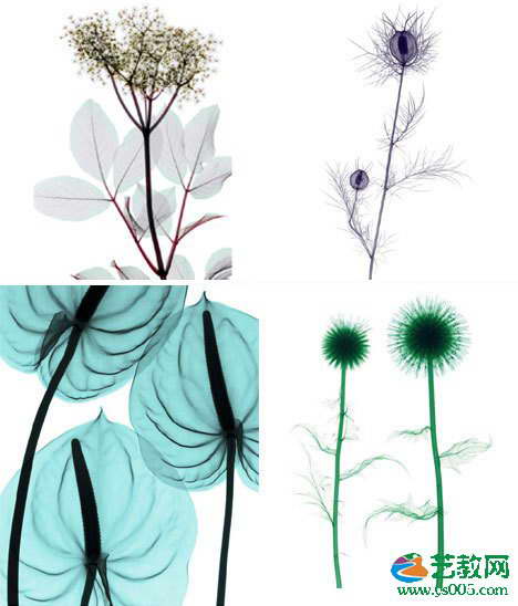 复杂而美丽的结构:接骨木花(左上)、黑种草(右上)、火鹤花(左下)和蓟(右下)。这些彩色的X光照片帮助我们更深刻地认识自然界的复杂美。这些表面上看起来简单的花朵,在X光下显露出它们隐藏于内部的复杂而美丽的结构。这些看起来平淡无奇的植物,在X光下显露出它们真正奇异的本质。