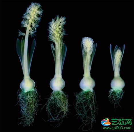 隐藏的美:洋桔梗花(左上)、玫瑰(右上)、百子莲(左下)和百合花(右下)。尽管特维并不是第一个将X光当作艺术的艺术家,但他却是最著名、最受尊重的一位。他的X光艺术以一种完全新奇的方式来描述我们熟悉的事物。特维的X光照片表现了普通事物那种长期被隐藏的美,有时候人们可以从照片中发现最普通事物的最迷人特性。