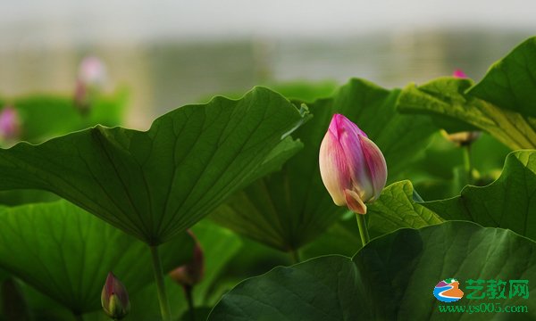 前面的荷叶组成“之”字,将视觉中心引向荷花