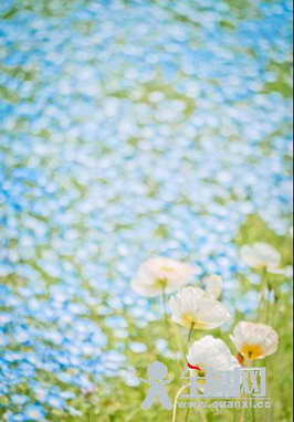 例如这张白罂粟花的照片,正好罂粟花田后有一小片小蓝花田,就让小蓝花当作背景衬托罂粟花啰。这种拍摄手法用望远镜头会比较容易达成,尤其在花海不够大片的时候。