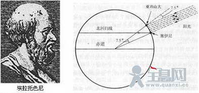 细心的埃拉托色尼发现:离亚历山大城约800公里的塞恩城(今埃及阿斯旺附近),夏日正午的阳光一直照到井底,因而这时候所有地面上的直立物都应该没有影子。但是,亚历山大城地面上的直立物却有一段很短的影子。他认为:直立物的影子是由亚历山大城的阳光与直立物形成的夹角所造成。从地球是圆球和阳光直线传播这两个前提出发,从假想的地心向塞恩城和亚历山大城引两条直线,其中的夹角应等于亚历山大城的阳光与直立物形成的夹角。按照相似三角形的比例关系,已知两地之间的,便能测出地球的圆周长。埃拉托色尼测出夹角约为7度,是地球圆周角(360度)的五十分之一,由此推算地球的周长大约为4万公里,这与实际地球周长(40076公里)相差无几。他还算出太阳与地球间距离为1.47亿公里,和实际距离1.49亿公里也惊人地相近。这充分反映了埃拉托色尼的学说和。