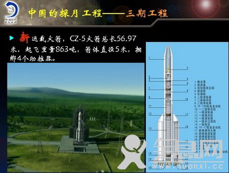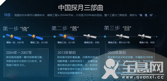 中国探月工程经过10年的酝酿,最终确定中国的探月工程分为“绕”、“落”、“回”3个阶段。第一期绕月工程将在2007年发射探月卫星“嫦娥一号”“嫦娥二号”,对月球表面环境、地貌、地形、地质构造与物理场进行探测。 第二期工程时间定为2007年至2016年,目标是研制和发射航天器,以软着陆的方式降落在月球上进行探测。具体方案是用安全降落在月面上的巡视车、自动机器人探测着陆区岩石与矿物成分,测定着陆点的热流和周围环境,进行高分辨率摄影和月岩的现场探测或采样分析,为以后建立月球基地的选址提供月面的化学与物理参数。
