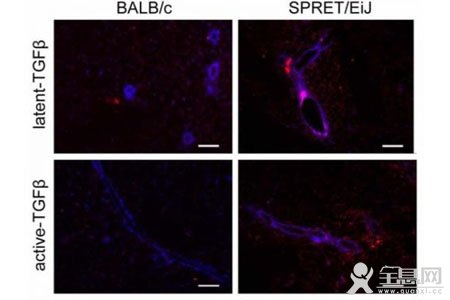 与癌症高发的小鼠的乳腺(左侧)相比,在那些对癌症有抵抗力的小鼠的乳腺(右侧)中,一种叫做转化生长因子(TGF beta)的肿瘤抑制蛋白的表达更加明显。这个信息有助于科学家了解,基因与环境的相互作用将如何影响肿瘤的发展。