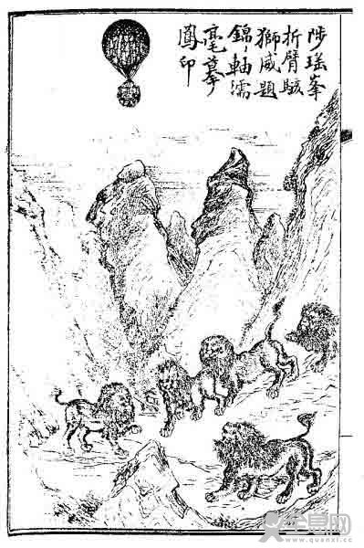 《月球殖民地小说》插图。这部由荒江钓叟撰写的小说《月球殖民地小说》,在1904-1905的《绣像小说》上断断续续连载。清末有许多小说就像这部一样,还没写完就结束了。图中章节名为“涉瑶峰折臂骇狮威,题锦轴濡毫摹凤”。