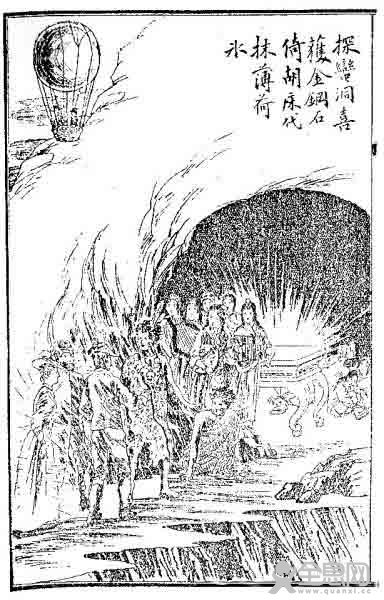 《月球殖民地小说》描述了侠义之人李安武与日本友人藤田玉太郎为帮助朋友龙孟华寻找妻儿,一起搭上宇太郎的空中军舰在地球周边飞翔的冒险故事。龙的儿子其实是在月球人的帮助下在月球世界留学。图为小说插图,图中章节名为“探蛮洞喜获金刚石,倚胡床代抹薄荷水”。