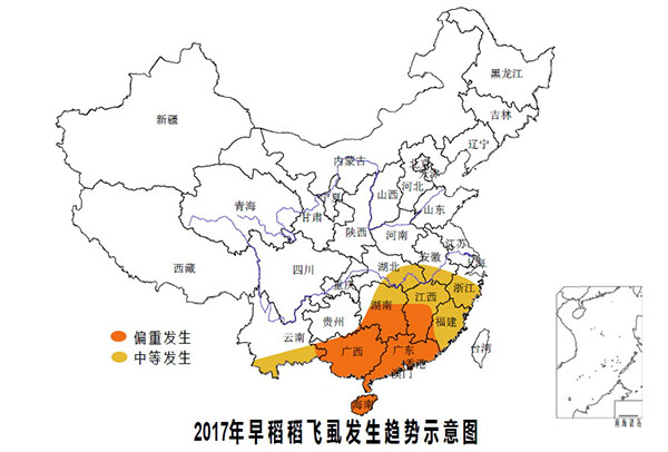 稻飞虱在华南大部、江南西南部稻区偏重发生,西南南部、江南东北部、长江中游稻区中等发生,接近常年,发生面积 7200万亩次。