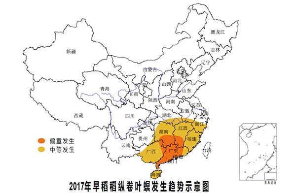 稻纵卷叶螟在华南和江南稻区总体中等发生,广东中西部、广西东北部、湖南和江西南部稻区偏重发生,发生面积6000万亩次。