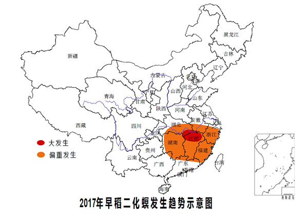 二化螟在江南和长江中游稻区偏重发生,赣中北、鄂东南等地大发生,重于上年,发生面积 6000万亩次;三化螟在华南和江南稻区偏轻发生,发生面积700万亩次;大螟在安徽沿江等局部地区呈明显上升态势。