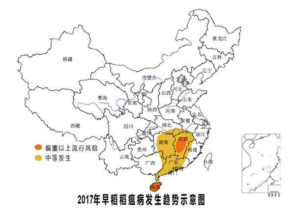 稻瘟病在华南中部、江南中西部和长江中游稻区中等发生,局部稻区偏重发生,发生面积1500万亩次。