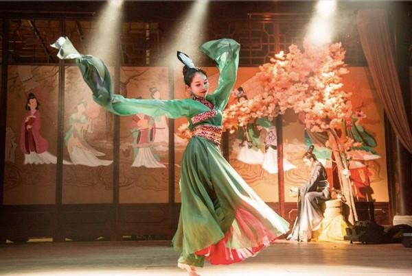 再来赏古风演艺。汉唐盛舞,惊鸿长衣,流风回雪,舞动汉唐盛世。所谓伊人,在水一方,一身古装手抚古琴,震撼人心三千年。